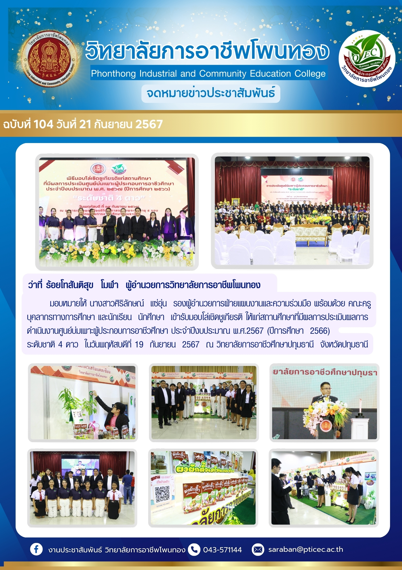 เข้ารับมอบโล่เชิดชูเกียรติ ให้แก่สถานศึกษาที่มีผลการประเมินผลการดำเนินงานศูนย์บ่มเพาะผู้ประกอบการอาชีวศึกษา ประจำปีงบประมาณ พ.ศ.2567 (ปีการศึกษา 2566) ระดับชาติ 4 ดาว