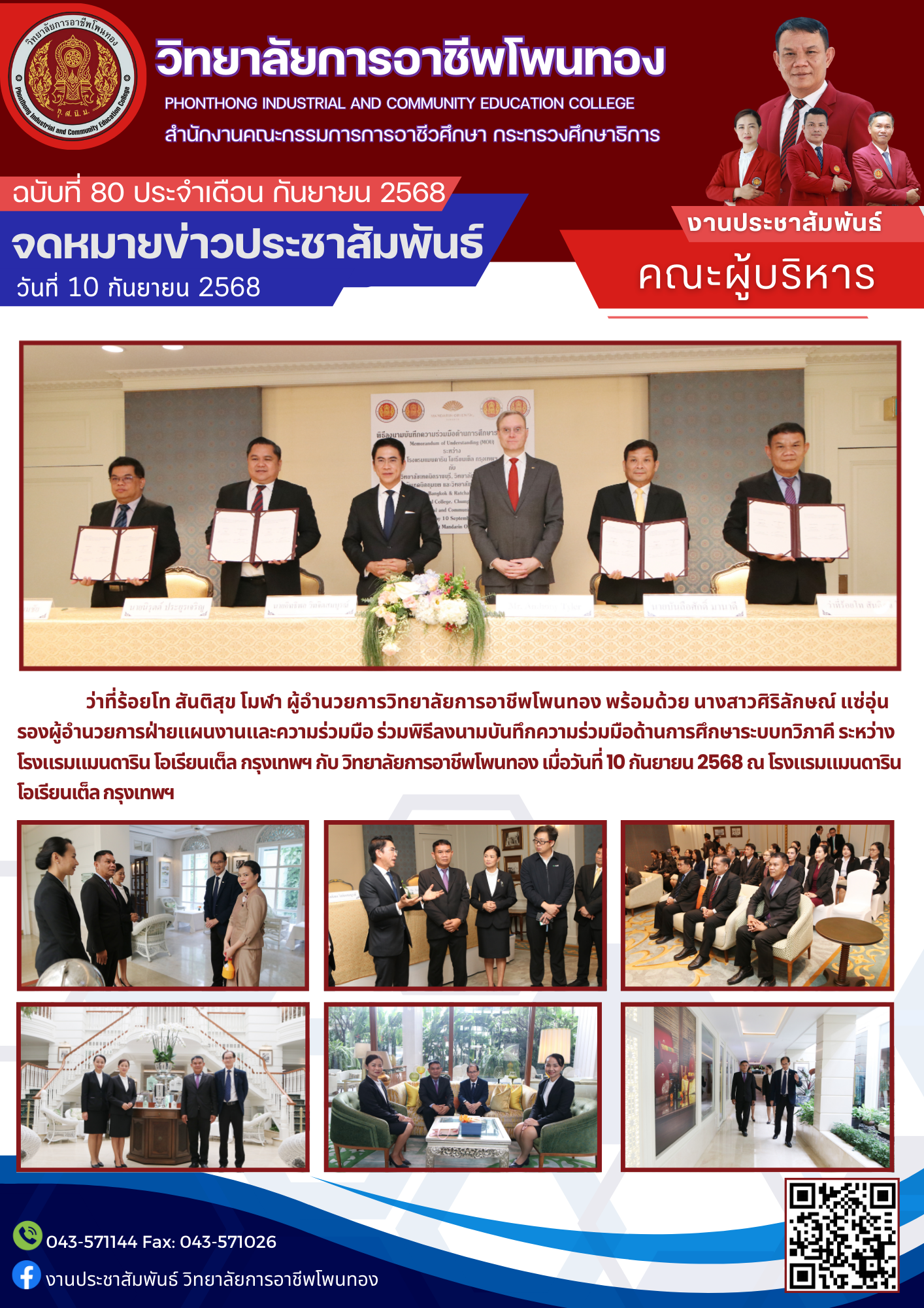 ว่าที่ ร้อยโท สันติสุข โมฬา ผู้อำนวยการวิทยาลัยการอาชีพโพนทอง พร้อมด้วย นางสาวศิริลักษณ์ แซ่อุ่น รองผู้อำนวยการฝ่ายแผนงานและความร่วมมือ ร่วมพิธีลงนามบันทึกความร่วมมือด้านการศึกษาระบบทวิภาคี ระหว่าง โรงแรมแมนดาริน โอเรียนเต็ล กรุงเทพฯ กับ วิทยาลัยการอาชีพโพนทอง เมื่อวันที่ 10 กันยายน 2568 ณ โรงแรมแมนดาริน โอเรียนเต็ล กรุงเทพฯ