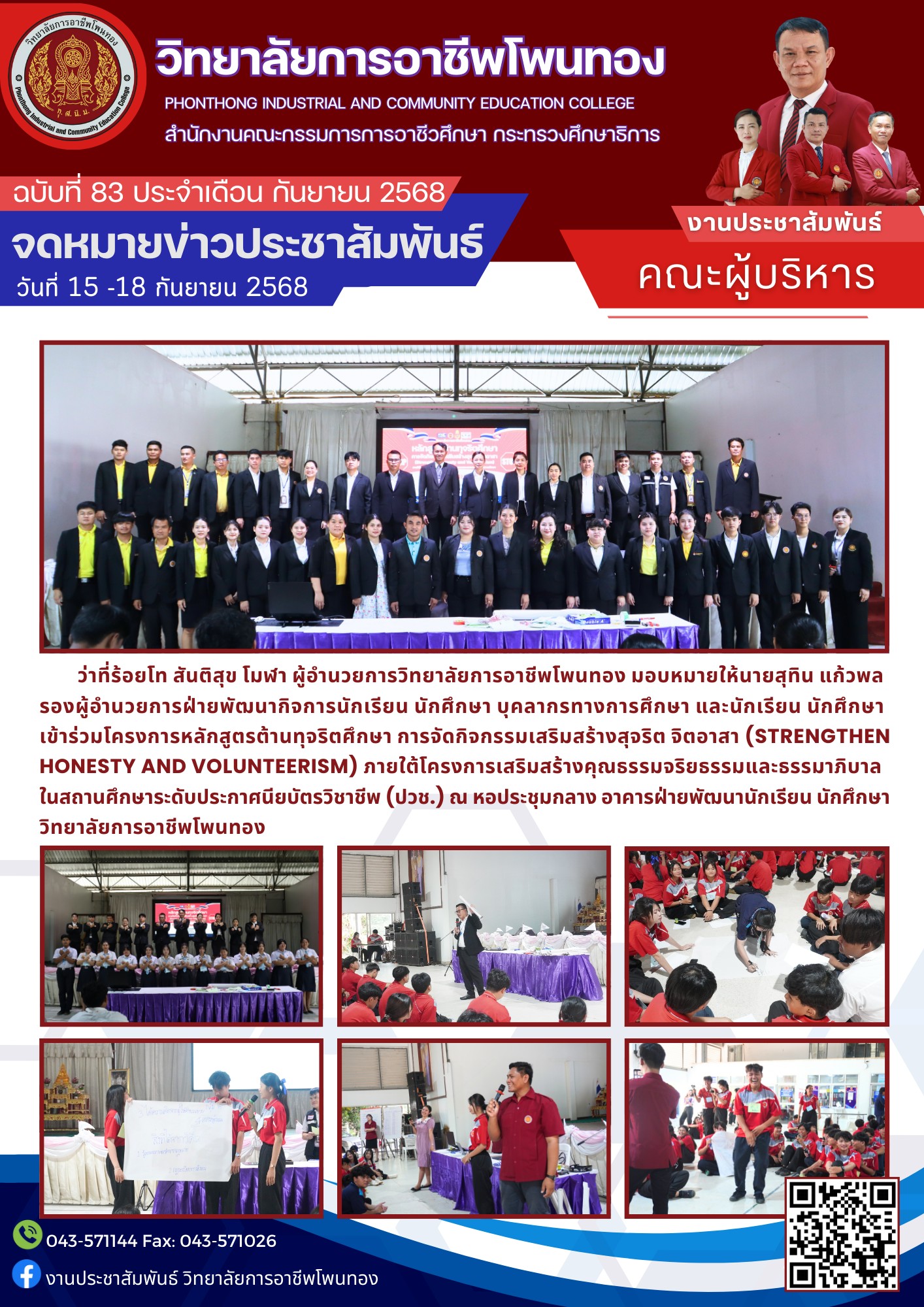 ว่าที่ ร้อยโท สันติสุข โมฬา ผู้อำนวยการวิทยาลัยการอาชีพโพนทอง มอบหมายให้นายสุทิน แก้วพล รองผู้อำนวยการฝ่ายพัฒนากิจการนักเรียน นักศึกษา บุคลากรทางการศึกษา และนักเรียน นักศึกษา เข้าร่วมโครงการหลักสูตรต้านทุจริตศึกษา การจัดกิจกรรมเสริมสร้างสุจริต จิตอาสา (STRENGTHEN HONESTY AND VOLUNTEERISM) ภายใต้โครงการเสริมสร้างคุณธรรม จริยธรรม และธรรมมาภิบาล ในถานศึกษาระดับประกาศนียบัตรวิชาชีพ (ปวช.) ณ หอประชุมกลาง อาคารฝ่ายพัฒนานักเรียน นักศึกษา วิทยาลัยการอาชีพโพนทอง