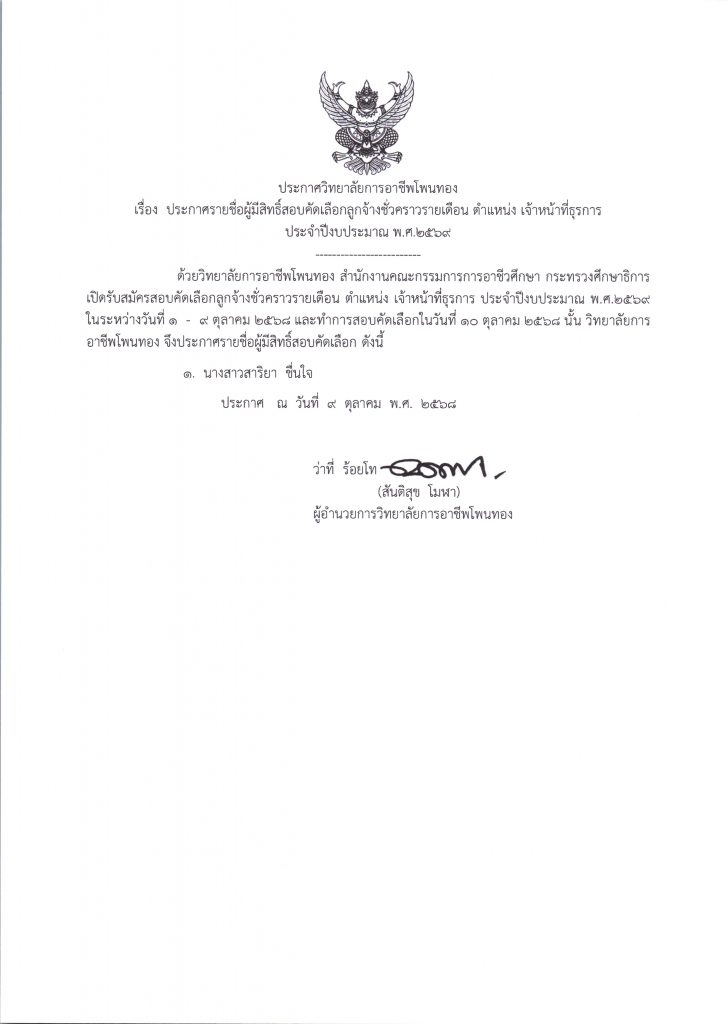 ประกาศรายชื่อผู้มีสิทธิ์สอบคัดเลือกลูกจ้างชั่วคราวรายเดือน ตำแหน่งเจ้าหน้าที่ธุรการ ประจำปีงบประมาณ พ.ศ. 2569