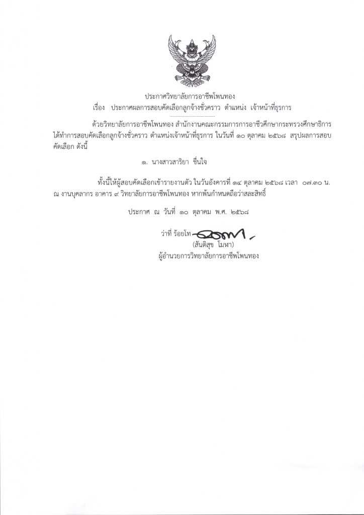 ประกาศผลการสอบคัดเลือกลูกจ้างชั่วคราว ตำแหน่ง เจ้าหน้าที่ธุรการ