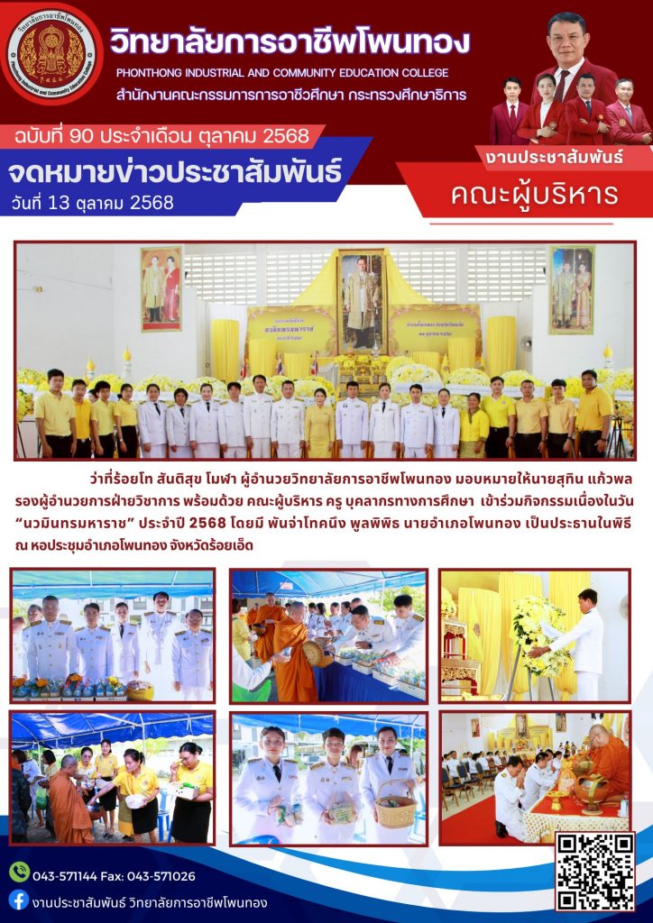ว่าที่ ร้อยโท สันติสุข โมฬา ผู้อำนวยการวิทยาลัยการอาชีพโพนทอง มอบหมายให้นายสุทิน แก้วพล รองผู้อำนวยการฝ่ายวิชาการ พร้อมด้วย คณะผู้บริหาร ครู บุคลากรทางการศึกษา เข้าร่วมกิจกกรมเนื่องในวัน “นวมินทรมหาราช” ประจำปี 2568 โดยมี พันจ่าโทคนึง พูลพิพิธ นายอำเภอโพนทอง เป็นประธานในพิธี ณ หอประชุมอำเภอโพนทอง จังหวัดร้อยเอ็ด