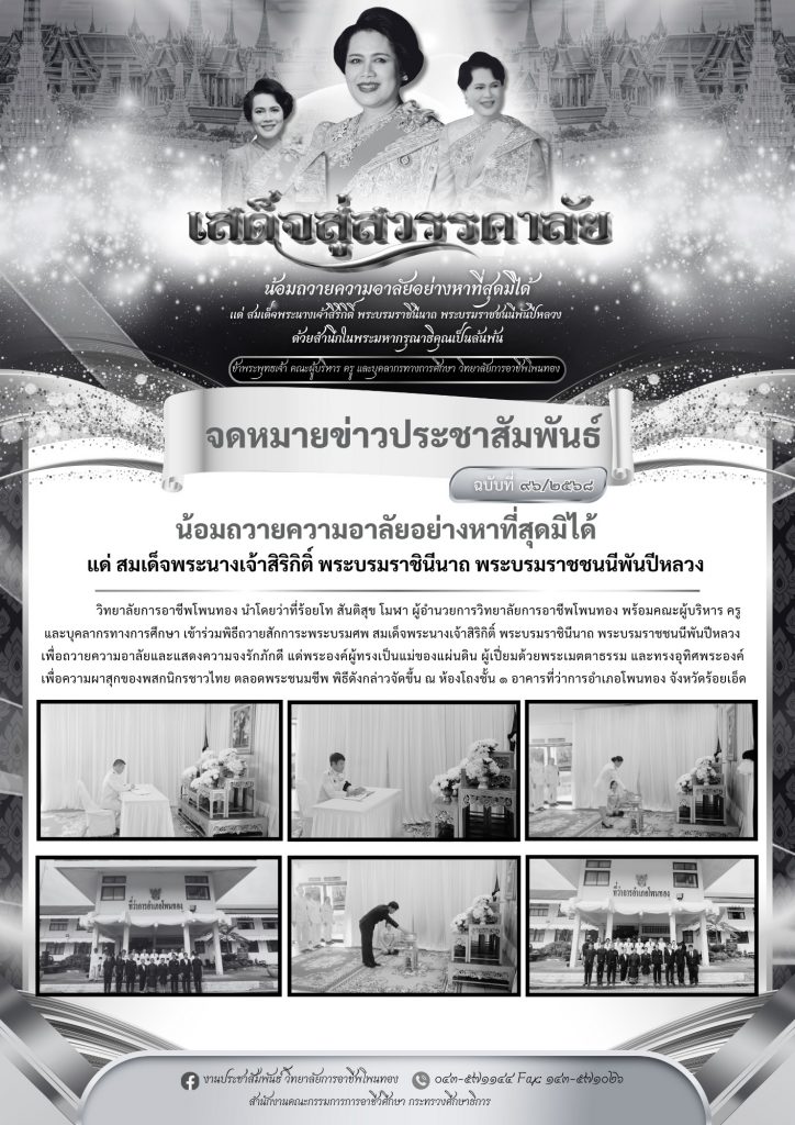 วิทยาลัยการอาชีพโพนทอง นำโดย ว่าที่ ร้อยโท สันติสุข โมฬา ผู้อำนวยการวิทยาลัยการอาชีพโพนทอง พร้อมคณะผู้บริหาร ครู และบุคลากรทางการศึกษา เข้าร่วมพิธีถวายสักการะพระบรมศพ สมเด็จพระนางเจ้าสิริกิติ์ พระบรมราชินีนาถ พระบรมราชชนนีพันปีหลวง เพื่อถวายความอาลัยและแสดงความจงรักภักดี แด่พระองค์ผู้ทรงเป็นแม่ของแผ่นดิน ผู้เปี่ยมด้วยพระเมตตาธรรม และทรงอุทิศพระองค์เพื่อความผาสุกของพสกนิกรชาวไทย ตลอดพระชนมชีพ พิธีดังกล่าวจัดขึ้น ณ ห้องโถงชั้น 1 อาคารที่ว่าการอำเภอโพนทอง จังหวัดร้อยเอ็ด
