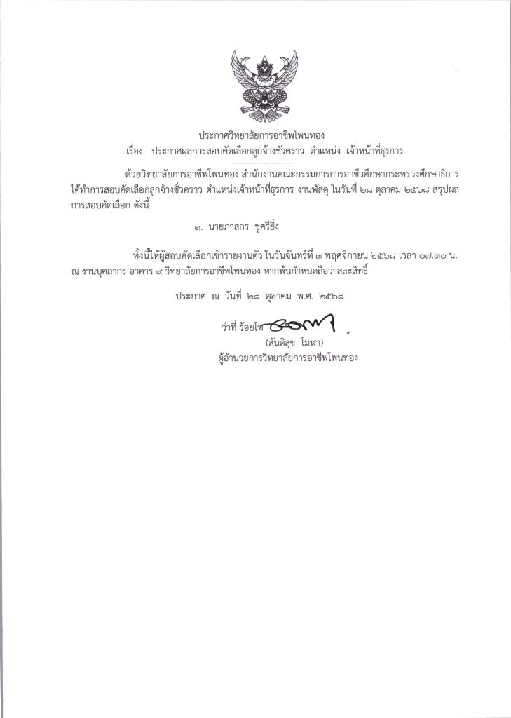 ประกาศผลการสอบคัดเลือกลูกจ้างชั่วคราว ตำแหน่งเจ้าหน้าที่ธุรการ