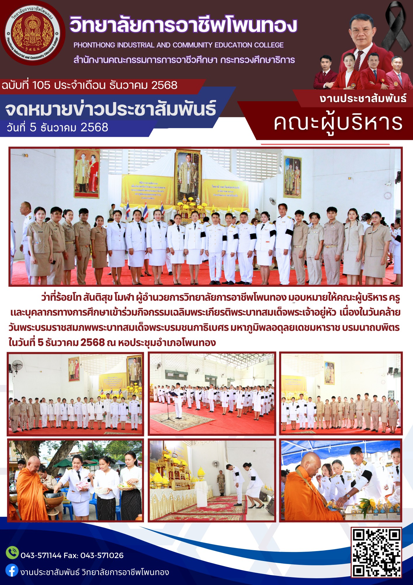 ว่าที่ ร้อยโท สันติสุข โมฬา ผู้อำนวยการวิทยาลัยการอาชีพโพนทอง มอบหมายให้คณะผู้บริหาร ครู และบุคลากรทางการศึกษา เข้าร่วมกิจกรรมเฉลิมพระเกียรติพระบาทสมเด็จพระเจ้าอยู่หัว เนื่องในวันคล้ายวันพระบรมราชสมภพพระบาทสมเด็จพระบรมชนกาธิเบศร มหาภูมิพลอดุลยเดชมหาราช บรมนาถบพิตร ในวันที่ 5 ธันวาคม 2568 ณ หอประชุมอำเภอโพนทอง