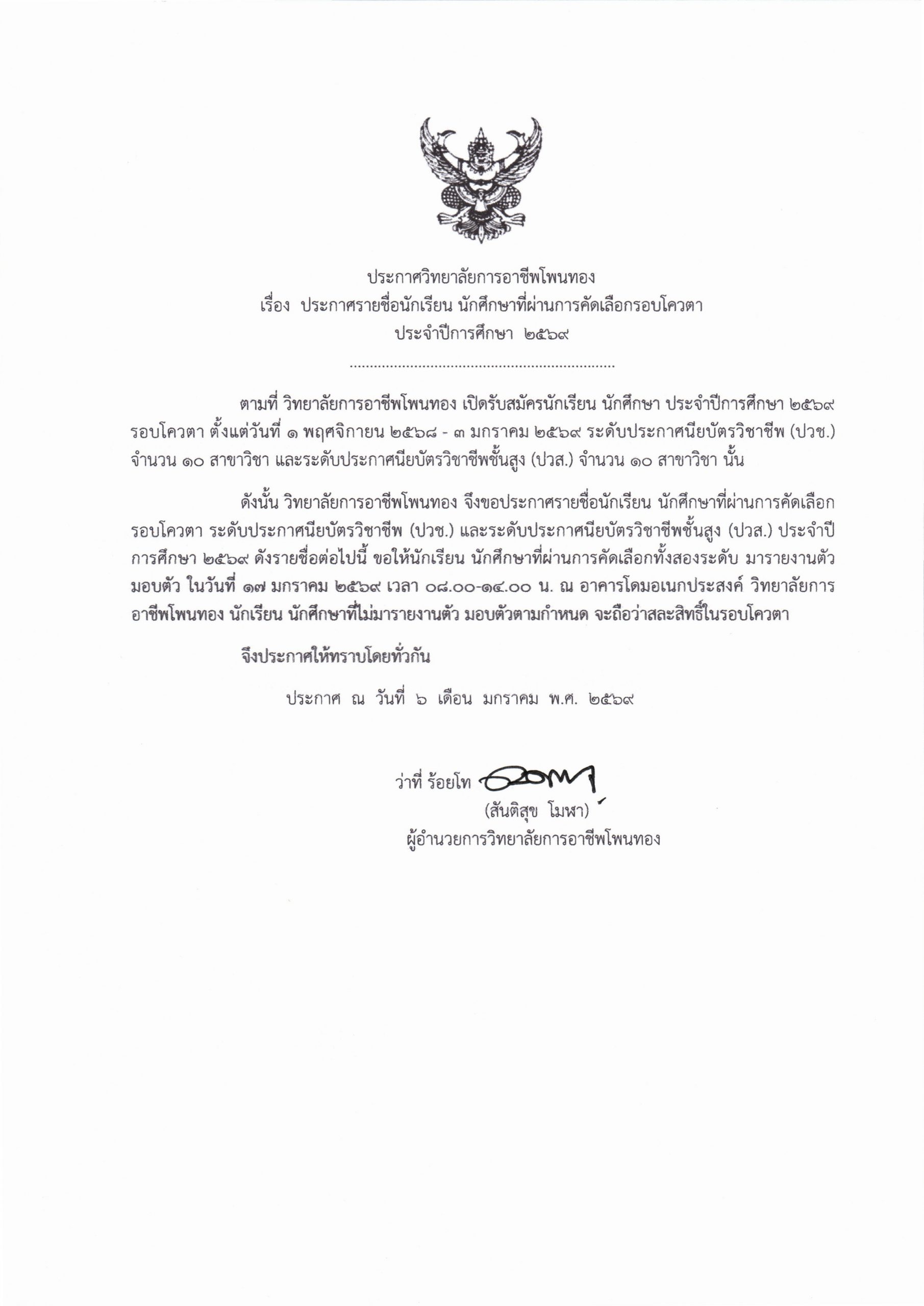 ประกาศรายชื่อนักเรียน นักศึกษา ที่ผ่านการคัดเลือกรอบโควตา ประจำปีการศึกษา 2569