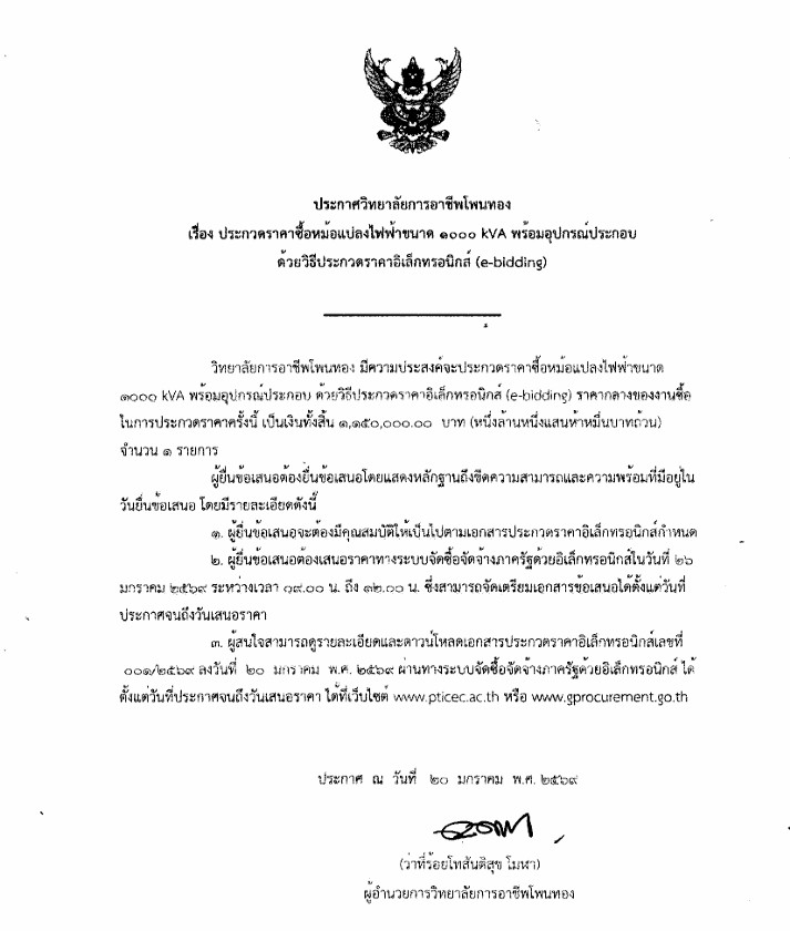 ประกาศ เรื่อง ประกวดราคาซื้อหม้อแปลงไฟฟ้า ขนาด 1000 kVA พร้อมอุปกรณ์ประกอบ ด้วยวิธีประกวดราคาอิเล็กทรอนิกส์ (e-bidding)