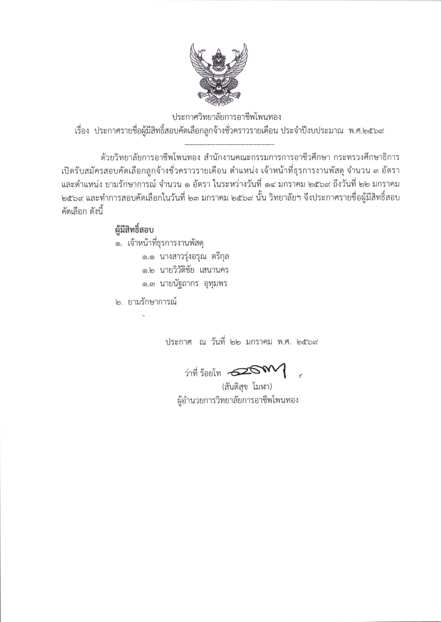 ประกาศรายชื่อผู้มีสิทธิ์สอบคัดเลือกลูกจ้างชั่วคราวรายเดือน ประจำปีงบประมาณ พ.ศ. 2569