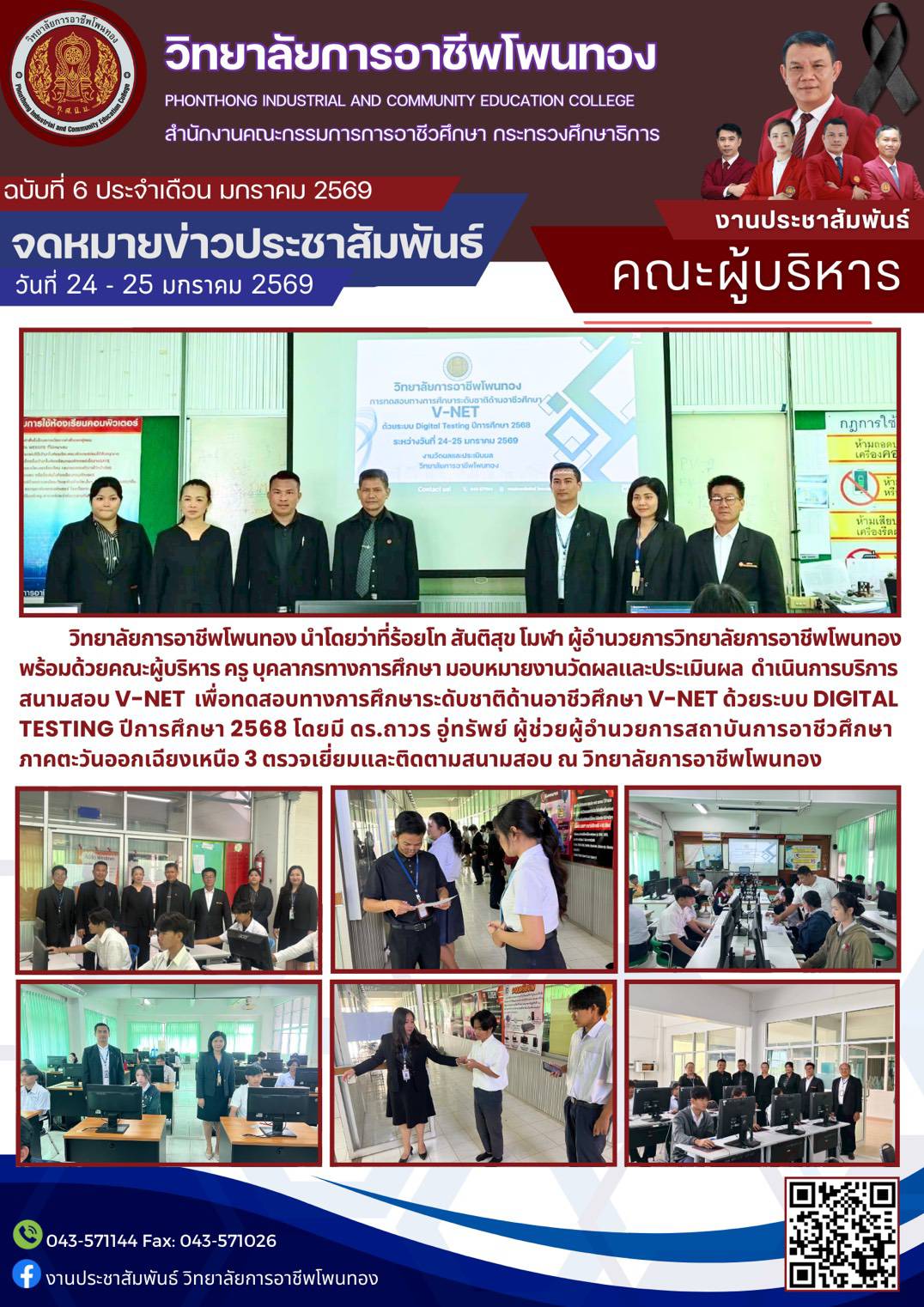 วิทยาลัยการอาชีพโพนทอง นำโดย ว่าที่ ร้อยโท สันติสุข โมฬา ผู้อำนวยการวิทยาลัยการอาชีพโพนทอง พร้อมด้วยคณะผู้บริหาร ครู บุคลากรทางการศึกษา มอบหมายงานวัดผลปละประเมินผล ดำเนินการบริการสนามสอบ V-NET เพื่อทดสอบทางการศึกษาระดับชาติด้านอาชีวศึกษา V-NET ด้วยระบบ DIGITAL TESTING ปีการศึกษา 2568 โดยมี ดร.ถาวร อู่ทรัพย์ ผู้ช่วยผู้อำนวยการสถาบันการอาชีวศึกษาภาคตะวันออกเฉียงเหนือ 3 ตรวจเยี่ยมและติดตามสนามสอบ ณ วิทยาลัยการอาชีพโพนทอง