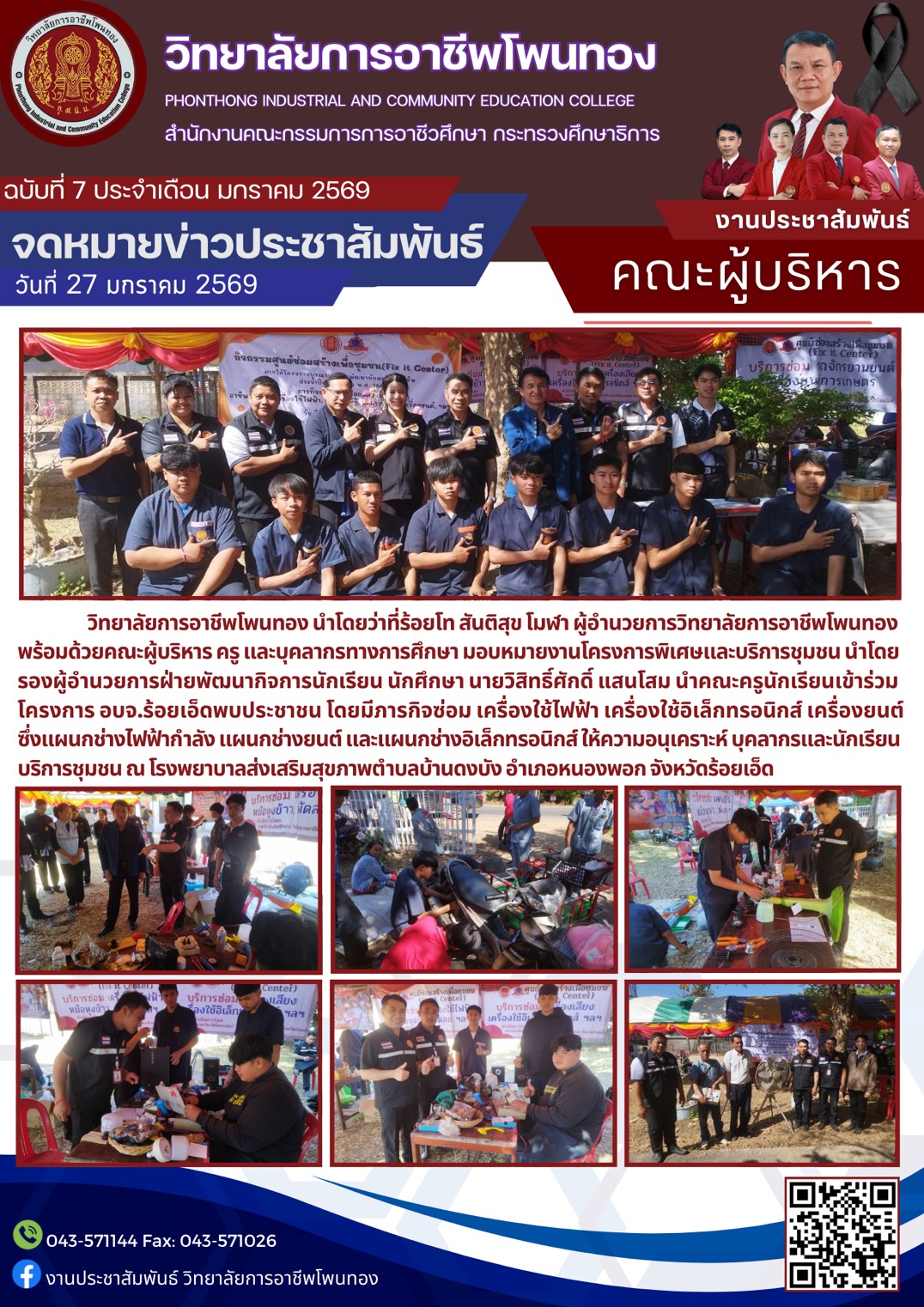 วิทยาลัยการอาชีพโพนทอง นำโดย ว่าที่ร้อยโท สันติสุข โมฬา ผู้อำนวยการวิทยาลัยการอาชีพโพนทอง พร้อมด้วยคณะผู้บริหาร ครู และบุคลากรทางการศึกษา มอบหมายงานโครงการพิเศษและบริการชุมชน นำโดย รองผู้อำนวยการฝ่ายพัฒนากิจการนักเรียน นักศึกษา นายวิสิทธิ์ศักดิ์ แสนโสม นำคณะครู นักเรียน เข่าร่วม โครงการ อบจ.ร้อยเอ็ด พบประชาชน โดยมีภารกิจซ่อมเครื่องใช้ไฟฟ้า เครื่องใช้อิเล็กทรอนิกส์ เครื่องยนต์ ซึ่งแผนกช่างไฟฟ้ากำลัง แผนกช่างยนต์ และแผนกช่างอิเล็กทรอนิกส์ ให้ความอนุเคราะห์ บุคลากรและนักเรียน บริการชุมชน ณ โรงพยาบาลส่งเสริมสุขภาพตำบลบ้านดงบัง อำเภอหนองพอก จังหวัดร้อยเอ็ด