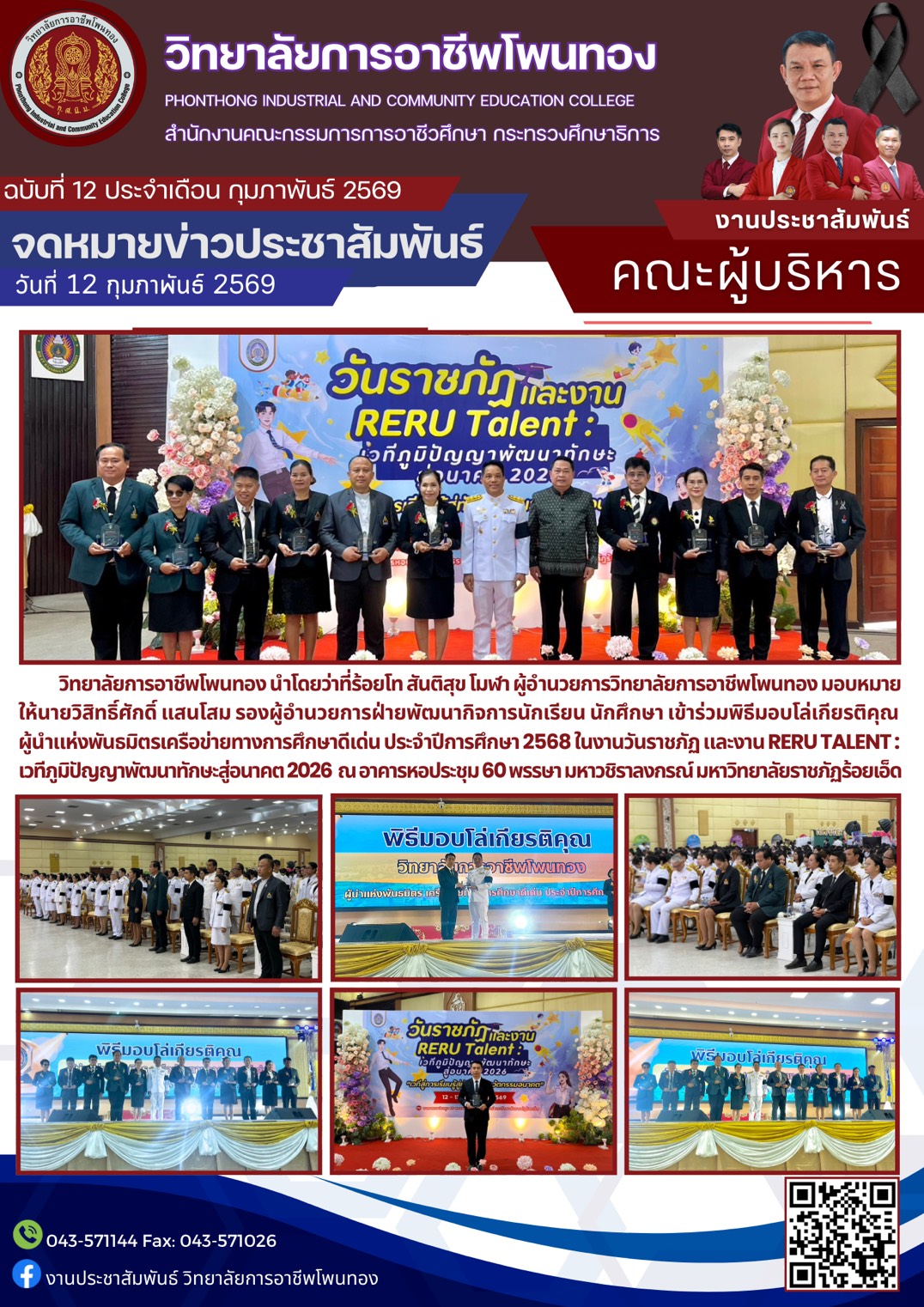 วิทยาลัยการอาชีพโพนทอง นำโดย ว่าที่ ร้อยโท สันติสุข โมฬา ผู้อำนวยการวิทยาลัยการอาชีพโพนทอง มอบหมายให้ นายวิสิทธิ์ศักดิ์ แสนโสม รองผู้อำนวยการฝ่ายพัฒนากิจการนักเรียน นักศึกษา เข้าร่วมพิธีมอบโล่เกียรติคุณผู้นำแห่งพันธมิตรเครือข่ายทางการศึกษาดีเด่น ประจำปีการศึกษา 2568 ในงานวันราชภัฏ และงาน RERU TALENT : เวทีภูมิปัญญาพัฒนาทักษะสู่อนาคต 2026 ณ อาคารหอประชุม 60 พรรษา มหาวชิราลงกรณ์ มหาวิทยาลัยราชภัฏร้อยเอ็ด