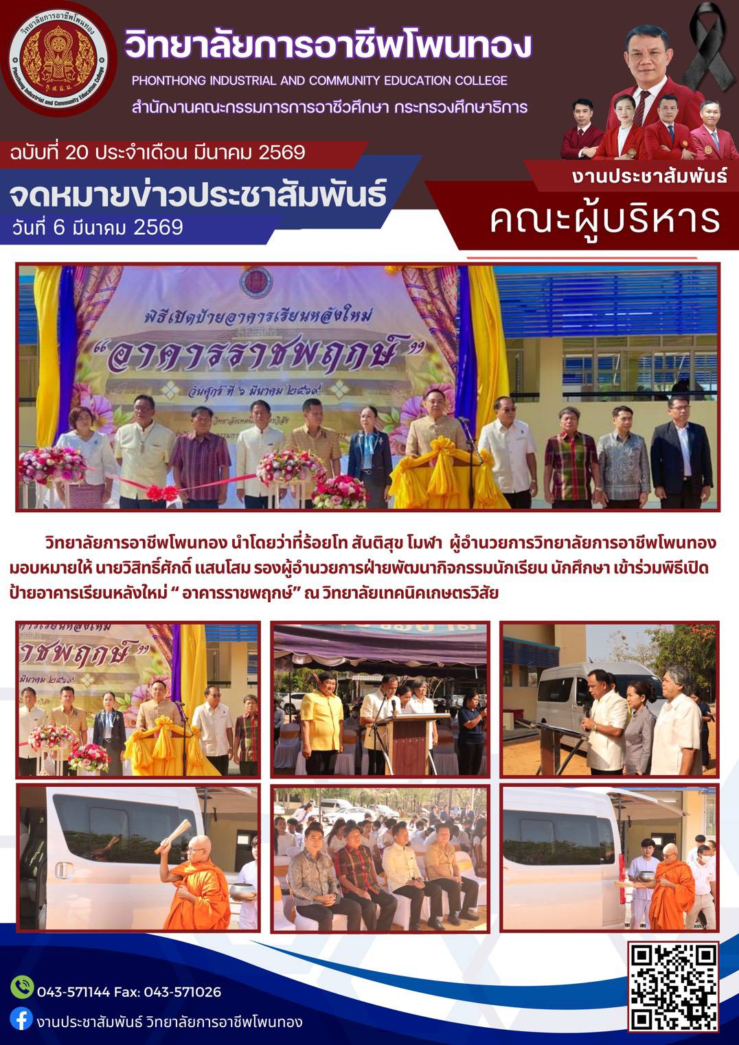 วิทยาลัยการอาชีพพโพนทอง นำโดย ว่าที่ ร้อยโท สันติสุข โมฬา ผู้อำนวยการวิทยาลัยการอาชีพโพนทอง มอบหมายให้ นายวิสิทธิ์ศักดิ์ แสนโสม รองผู้อำนวยการฝ่ายพัฒนากิจการนักเรียน นักศึกษา เข้าร่วมพิธีเปิดป้ายอาคารเรียนหลังใหม่ “อาคารราชพฤกษ์” ณ วิทยาลัยเทคนิคเกษตรวิสัย