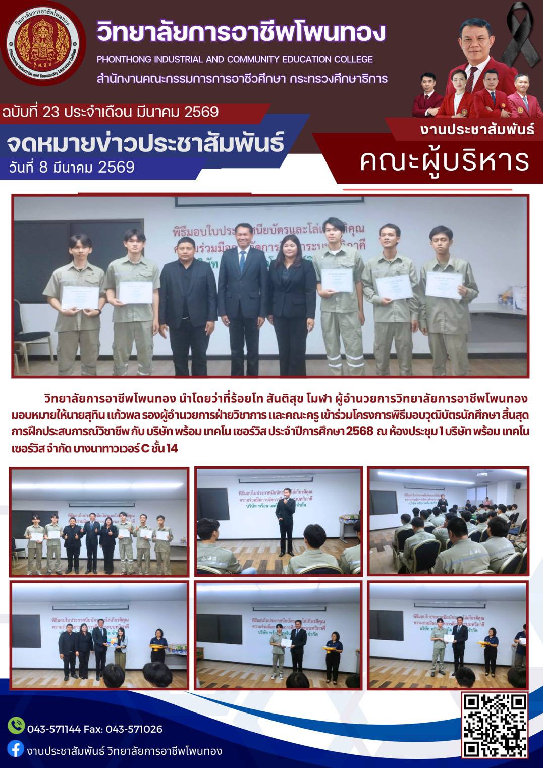 วิทยาลัยการอาชีพโพนทอง นำโดย ว่าที่ ร้อยโท สันติสุข โมฬา ผู้อำนวยการวิทยาลัยการอาชีพโพนทอง มอบหมายให้ นายสุทิน แก้วพล รองผู้อำนวยการฝ่ายวิชาการ และคณะครู เข้าร่วมโครงการพิธีมอบวุฒิบัตรนักศึกษา สิ้นสุดการฝึกประสบการณ์วิชาชีพ กับ บริษัท พร้อม เทคโน เซอร์วิส ประจำปีการศึกษา 2568 ณ ห้องประชุม 1 บริษัท พร้อม เทคโน เซอร์วิส จำกัด บางนาทาวเวอร์ C ชั้น 14