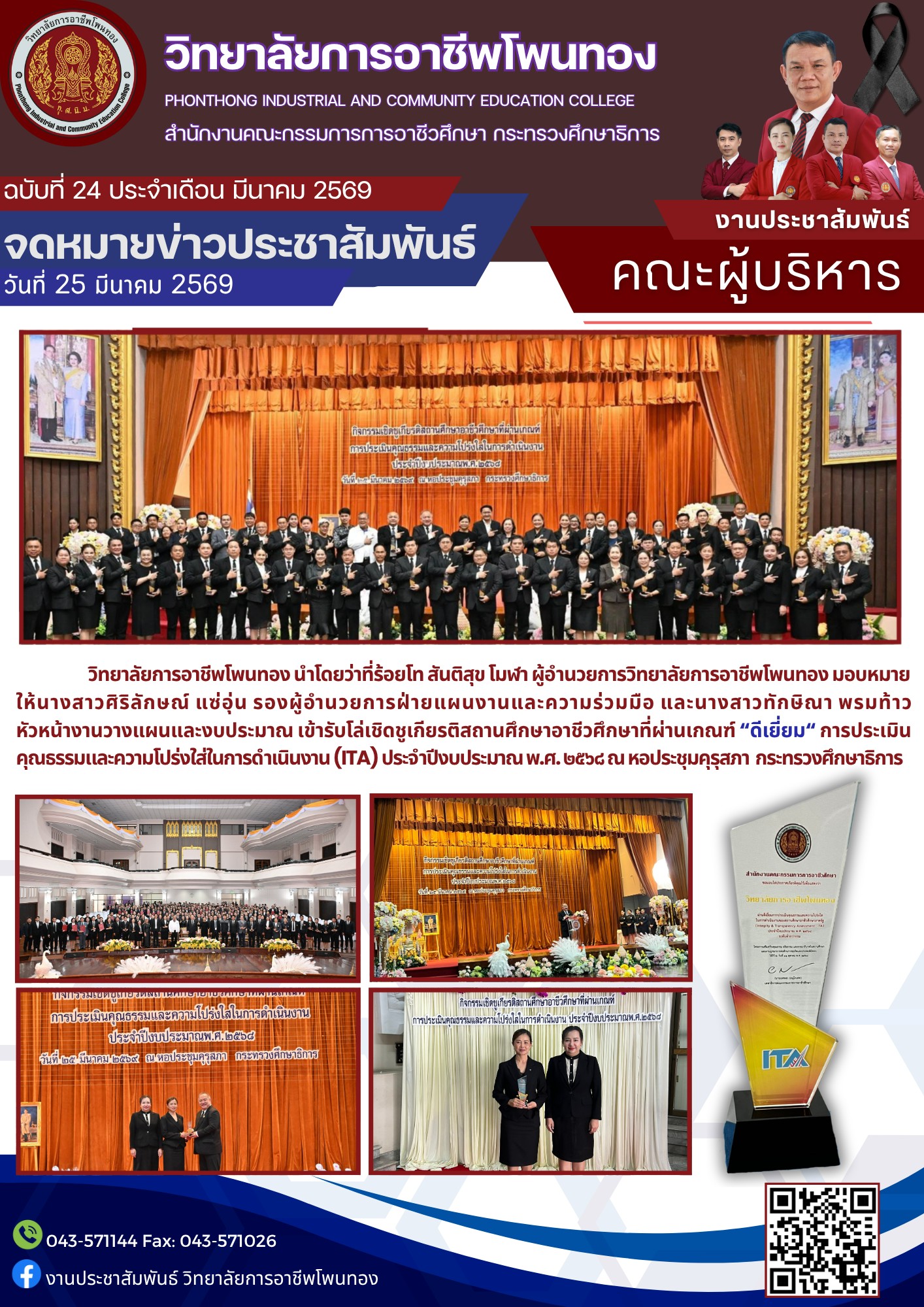 วิทยาลัยการอาชีพโพนทอง นำโดย ว่าที่ ร้อยโท สันติสุข โมฬา ผู้อำนวยการวิทยาลัยการอาชีพโพนทอง มอบหมายให้ นางสาวศิริลักษณ์ แซ่อุ่น รองผู้อำนวยการฝ่ายแผนงานและความร่วมมือ และนางสาวทักษิณา พรมท้าว หัวหน้างานวางแผนและงบประมาณ เข้ารับโล่เชิดชูเกียรติสถานศึกษาอาชีวศึกษาที่ผ่านเกณฑ์ “ดีเยี่ยม” การประเมินคุณธรรมและความโปร่งใสในการดำเนินงาน (ITA) ประจำปีงบประมาณ พ.ศ. 2568 ณ หอประชุมคุรุสภา กระทรวงศึกษาธิการ
